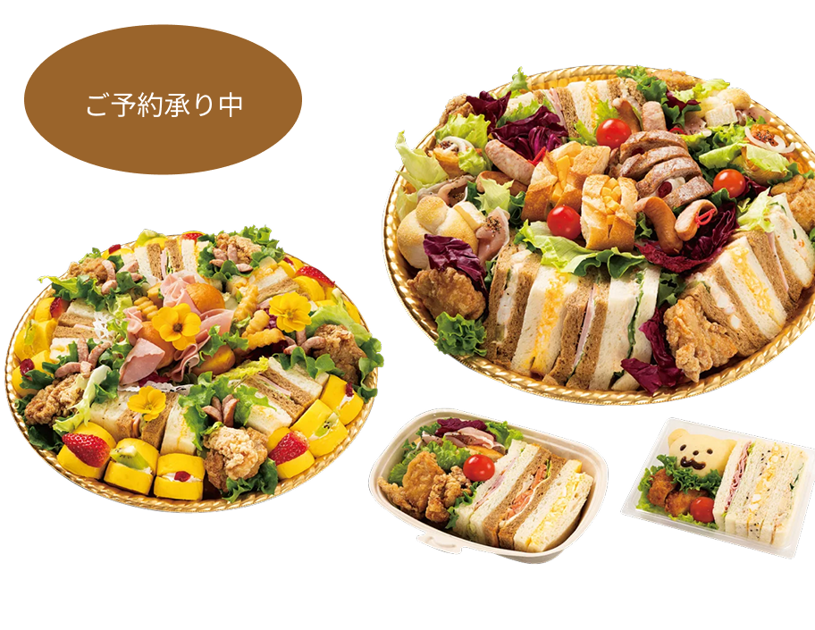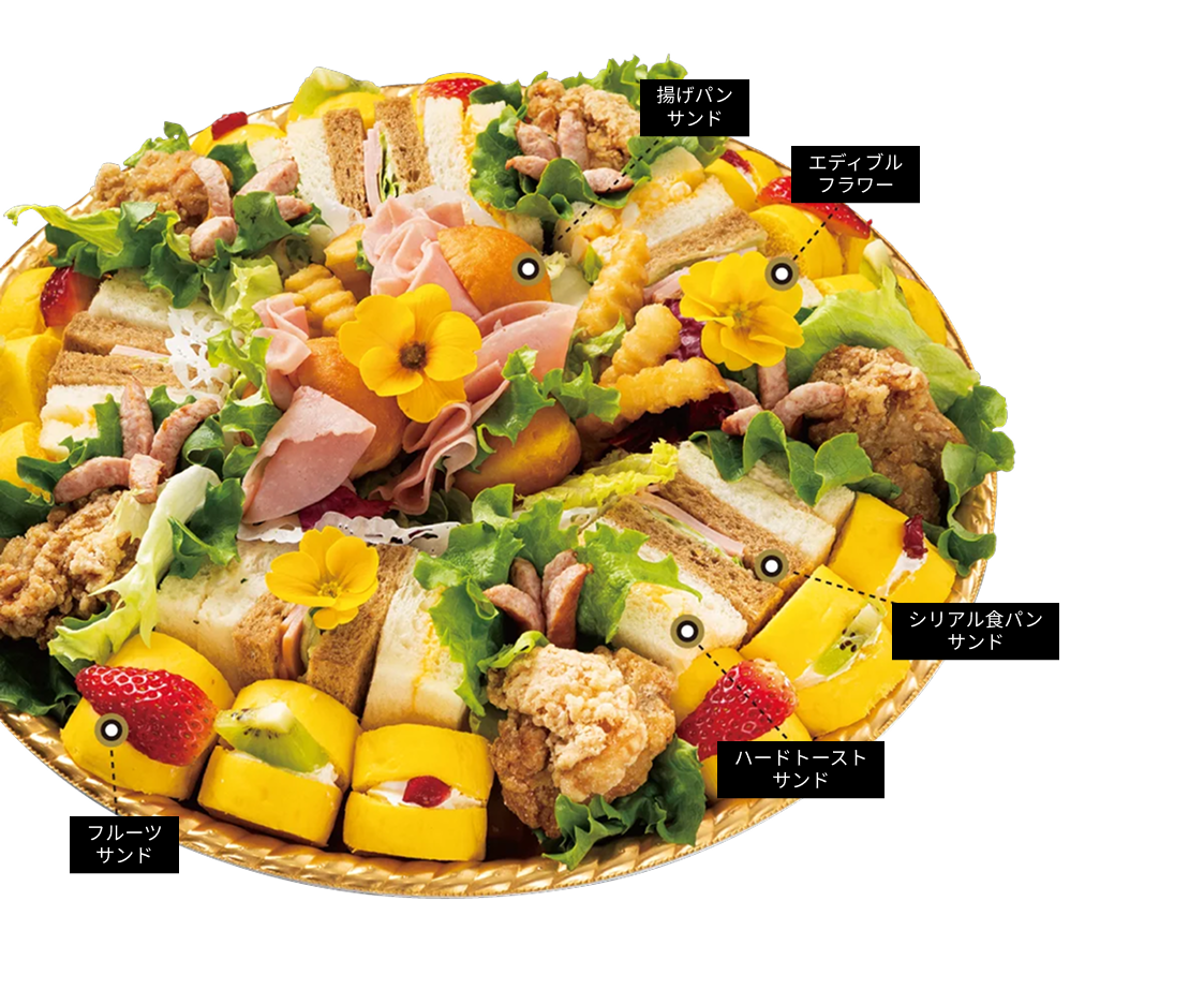 自慢のサンドウィッチラインナップから、食べ応えのあるおかずまで、多様なバラエティに富む、大人数向けの贅沢なオリジナルサンドウィッチオードブルです。