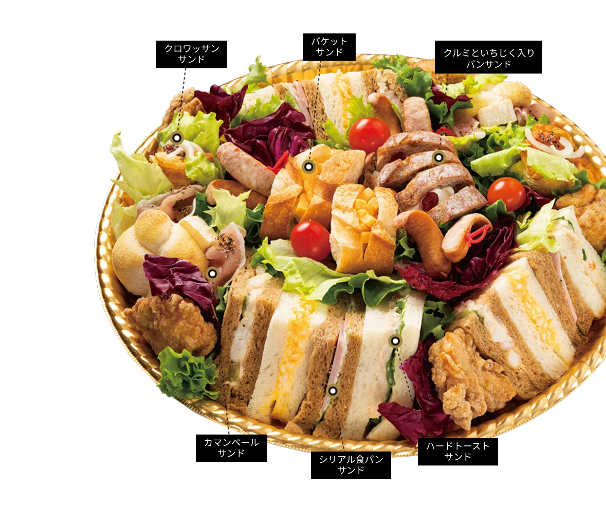 自慢のサンドウィッチラインナップから、食べ応えのあるおかずまで、多様なバラエティに富む、大人数向けの贅沢なオリジナルサンドウィッチオードブルです。